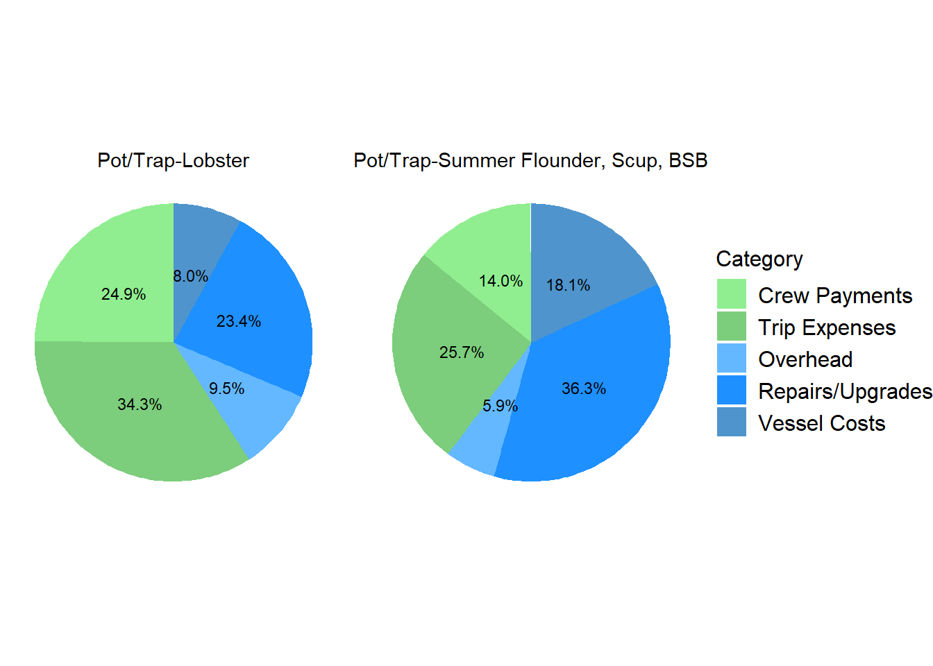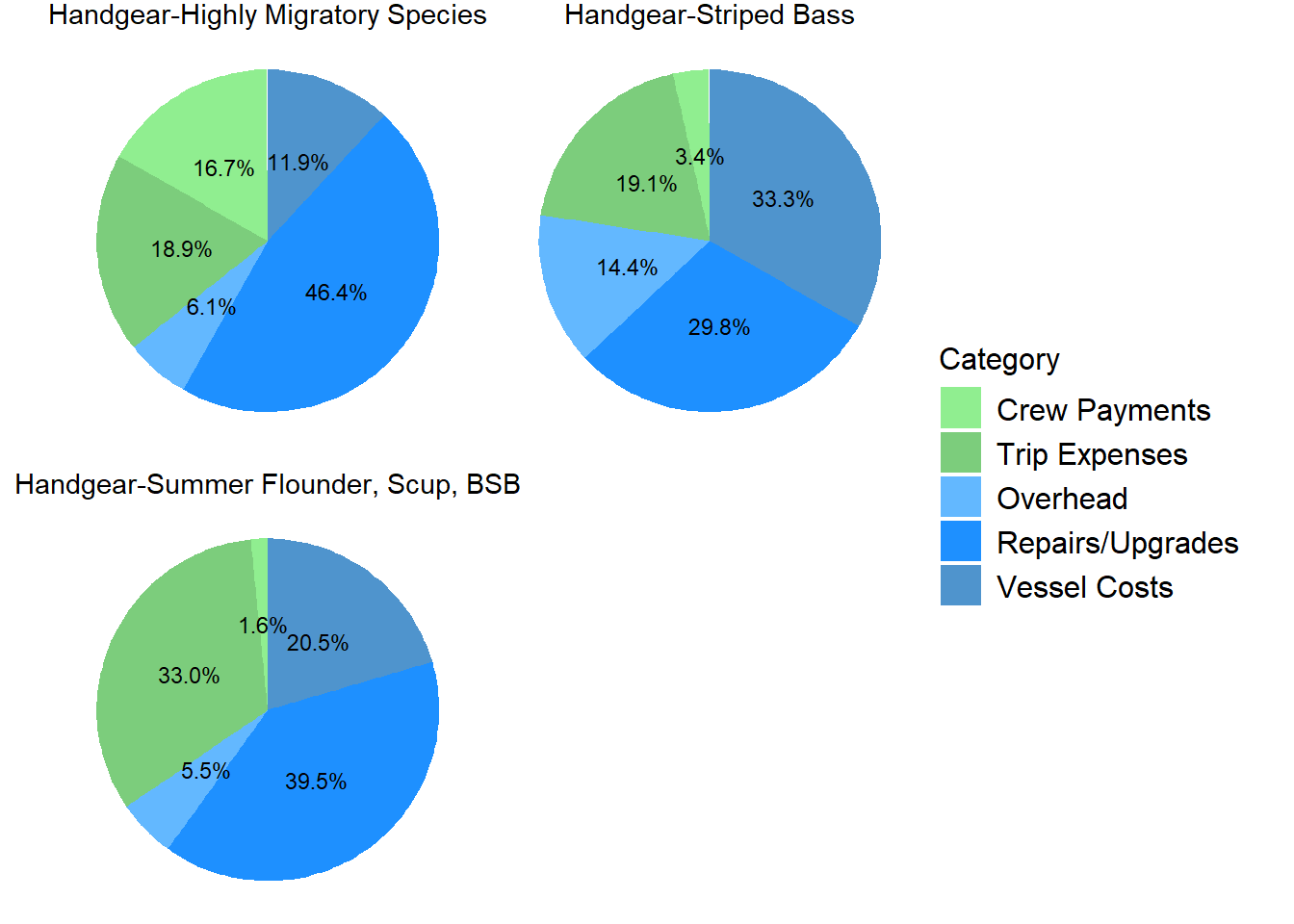 Pie chart by primary gear/fishery showing the distribution of costs incurred. Five cost categories are presented- crew payments, trip expenses, overhead, repairs/upgrades, and vessel costs. Trawl vessels, regardless of fishery, show a high crew expense of 34-36% of total costs. Pot/trap vessels show a high proportion of total costs as trip expenses with lobster vessels within that gear group at 34.3% and summer flounder, scup, black sea bass at 25.7%. Handgear vessels show a high proportion of total costs from repairs/upgrades with all fisheries at 30% or greater. Overhead costs encompass a similar percentage of total costs for all groups, generally from 4-10%. Vessel costs for trawl vessels are 6-10% across fisheries and 8% for the two pot/trap fisheries. Within the handgear group fisheries, vessel costs are a much more substantial portion of the total, ranging from 12-33%.