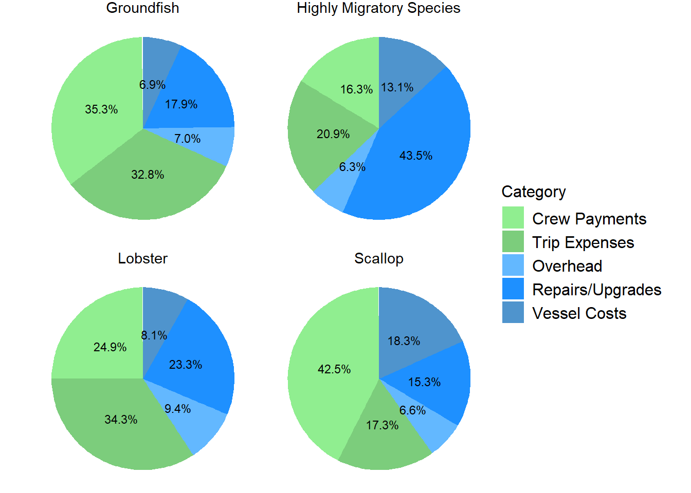 Pie chart by primary fishery showing the distribution of costs incurred. Five cost categories are presented- crew payments, trip expenses, overhead, repairs/upgrades, and vessel costs. Crew payments are highest in the scallop group, squid, mackerel, butterfish group, and groundfish group with the proportion of total costs from this cost category being 42.5%, 35.8%, and 35.3% respectively. Trip expenses are highest in the lobster group at 34.3% of total costs. Repairs/upgrades are highest in the handgear group at 43.5% of total costs. Overhead costs encompass a similar percentage of total costs for all fisheries, generally from 6-9%. Vessel costs are also relatively similar percentages, generally ranging from 7-18%.